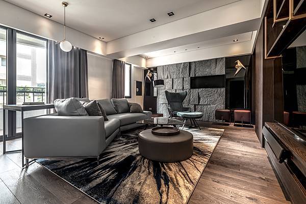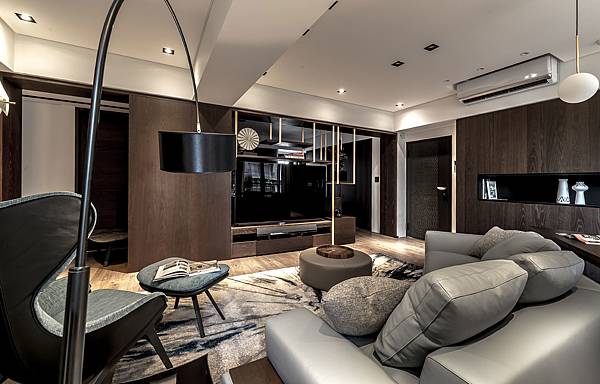 客廳領域,設計師採用深色木皮鋪陳電視牆面,搭配金屬勾勒奢華線條,一旁則運用花崗石皮打造牆面,堆疊立體視感,藉此呼應深色的木皮,傳達沉穩寧靜的空間氣韻。