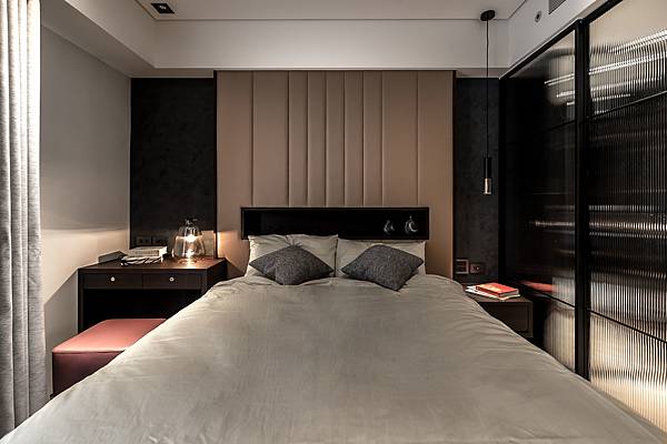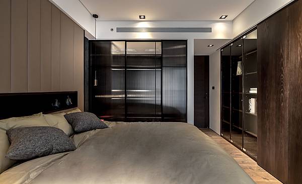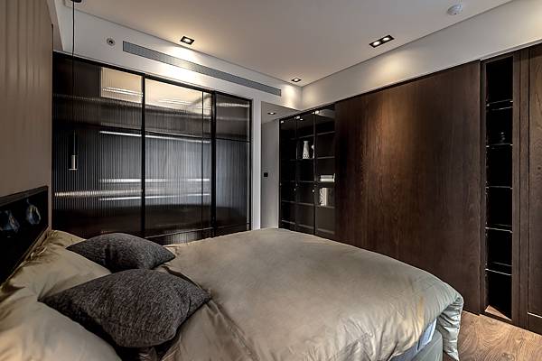 寢臥內,更衣室門片採用直紋玻璃打造,兼具通透性、立體感與朦朧之美,讓房間內的光線更充足;牆邊的置物櫃延用客廳的深色木皮把這聽的奢華感帶入臥室。床頭的部分則藉由特殊壁材彰顯品味,演繹材質深淺交織的漸層變化,並在牆與書桌旁各自規劃收納展示機能,嵌入細緻的燈光烘托,型塑大方優雅的飯店式格調!