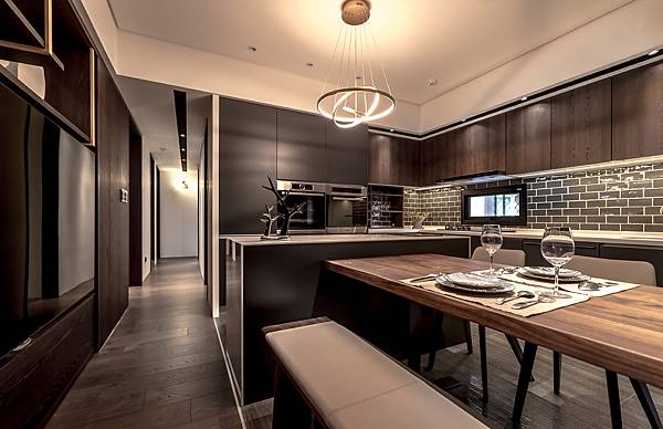 開放式的餐廚設定,則滿足家人情感交流的意義,配置俐落的 L 型廚具整合實用機能,以木皮輔以深色烤漆,佐以燈光的妝點照明,創造洗鍊沉著的整體質感。
