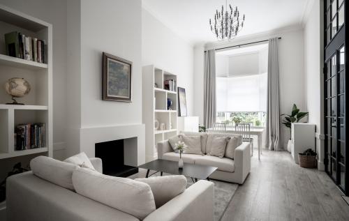 設計師在進門大廳休憩空間上,除使用白色、黑色體現風格純粹,窗邊灑進陽光在休憩區可以享受戶外的綠意,地板色以淺灰木色澤平鋪直述引導主動線,在低彩度的家中展現空間的餘韻。
