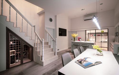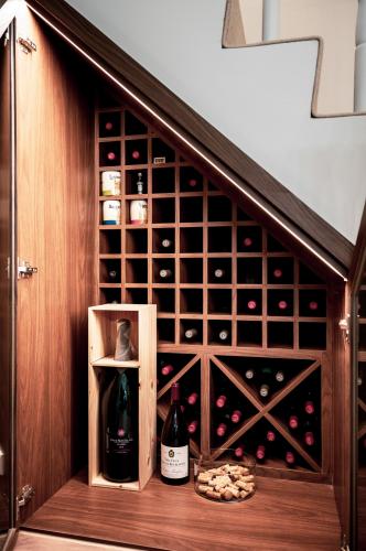 ▲善用畸零空間善加規劃樓梯間下方為紅酒收藏櫃,展示櫥窗與屋主的收藏酒。