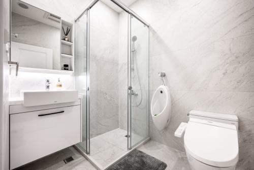 ▲整間浴室都是以石紋石英磚打造,大理石紋理的線條,讓空間視覺更加俐落。